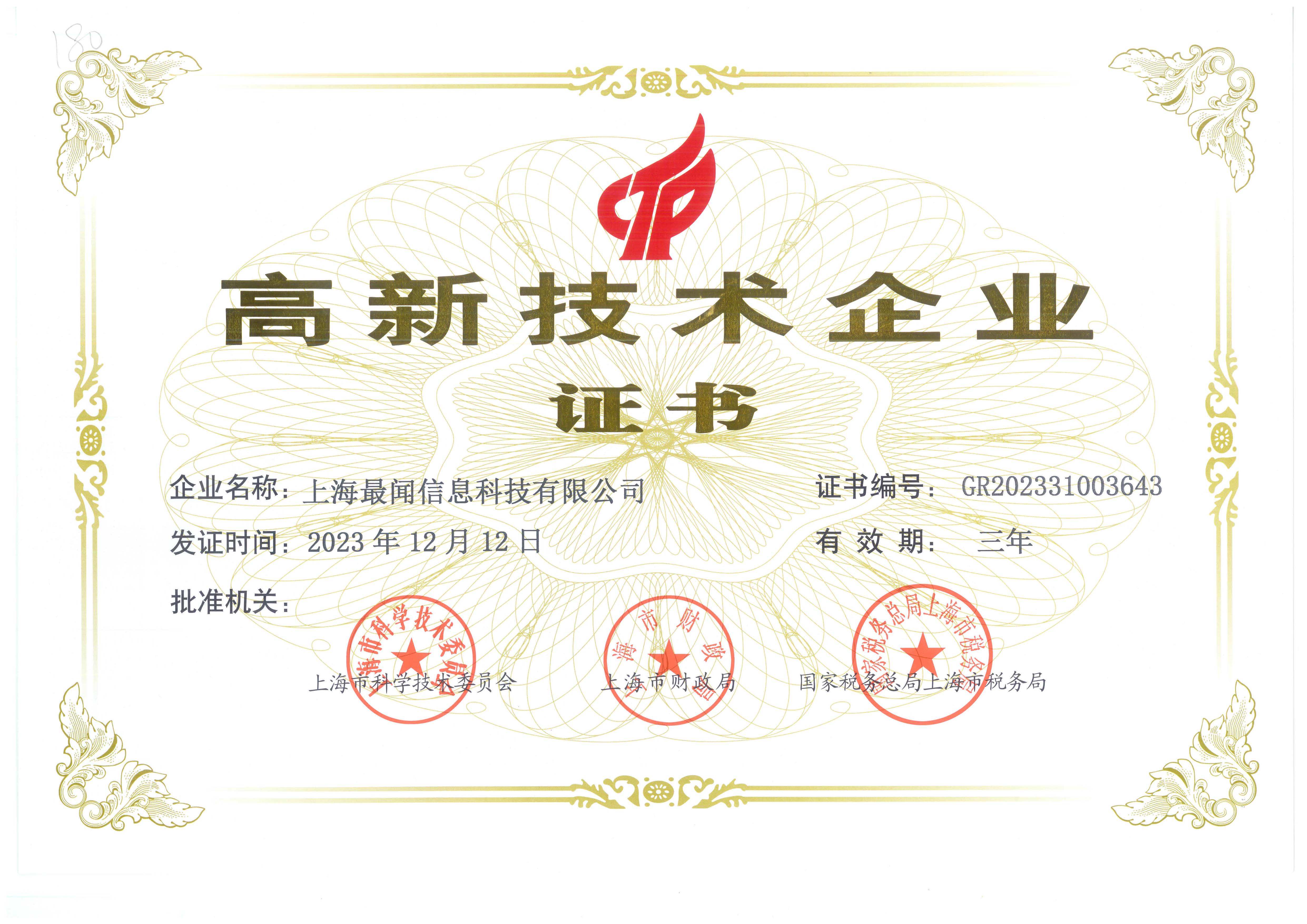 高新技術(shù)企業(yè)證書